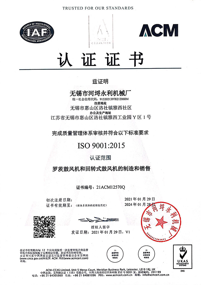 羅茨鼓風機和回轉式鼓風機的制造和銷售認證證書
